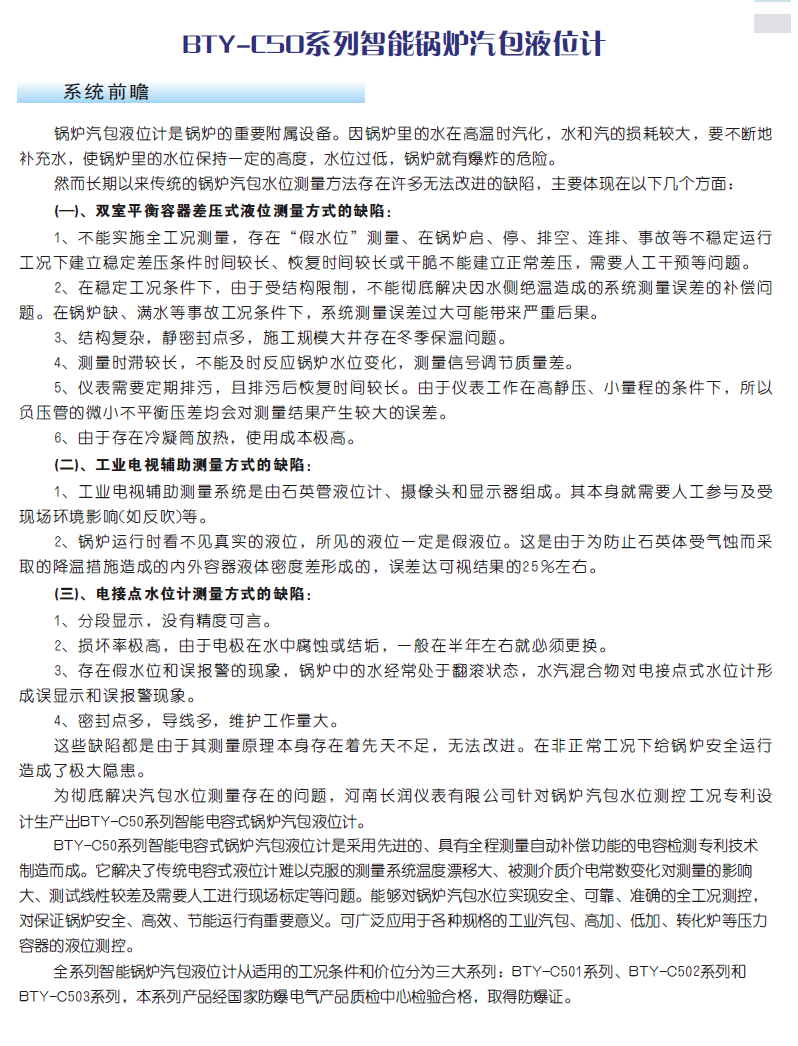 BTY-C系列電容式物位計采用一種基于全數字化電容測量方法,并運用多參數補償技術,研制出一系列高精度的物位計,已經在多個領域試用成功。例如安裝在機動車輛上的電容式油位傳感器,在各種強腐蝕、高溫、劇毒、爆炸等高危險場合使用的電容式高溫高壓液位計,能自動適應各種介質的高精度CT型物位計。這些物位計在有關行業(yè)試用,得到了有關行家的一致好評。